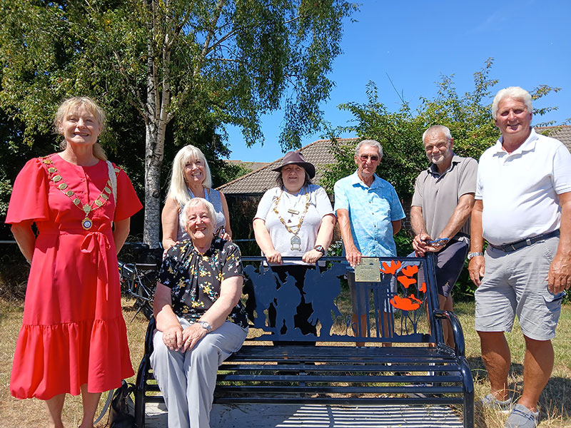 Mayor, town councillors and representatives from Stoke Lodge & The Common Parish Council attending Manor Farm roundabout memorial bench unveiling on Thursday 10th July 2025