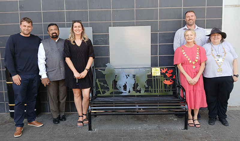 Mayor, town councillors and staff from the Willow Brook Centre attending the memorial bench unveiling at the Willow Brook Centre on Thursday 10th July 2025