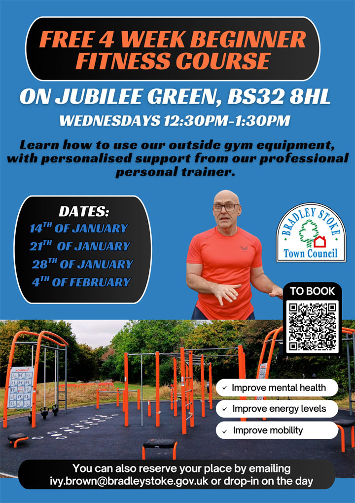 These sessions are for Bradley Stoke residents to learn how to use our outside leisure equipment at Jubilee Green with a trained professional. Designed for beginners to move their body, get out in the fresh air, and meet new people.