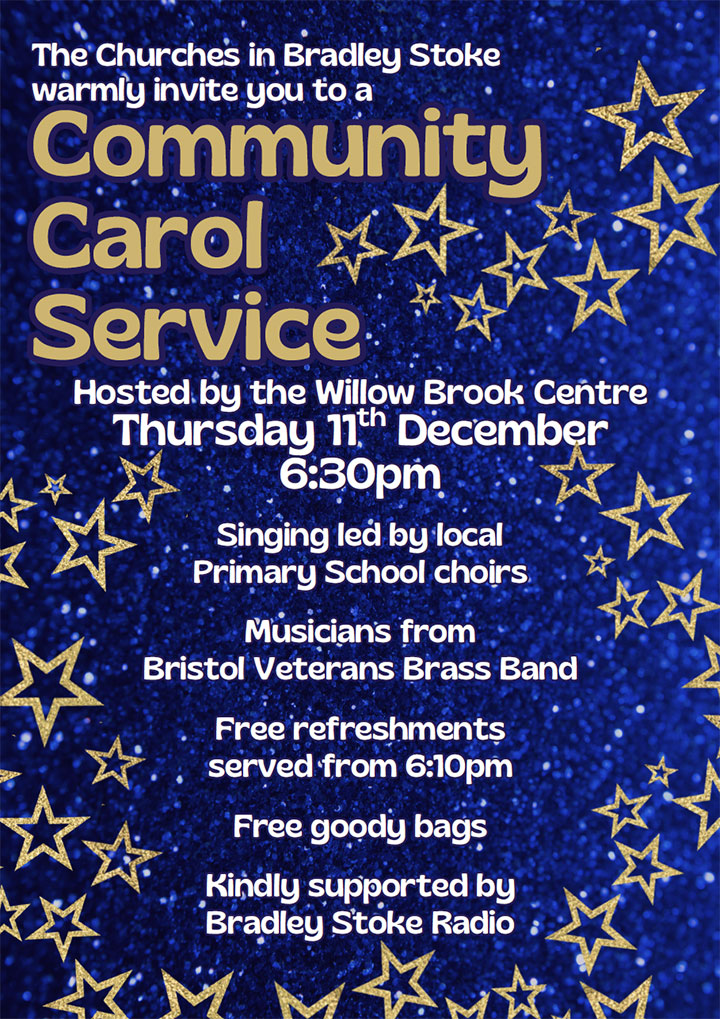 The Churches in Bradley Stoke warmly invite you to a Community Carol Service hosted by the Willow Brook Centre on Thursday 11th December at 6:30pm.