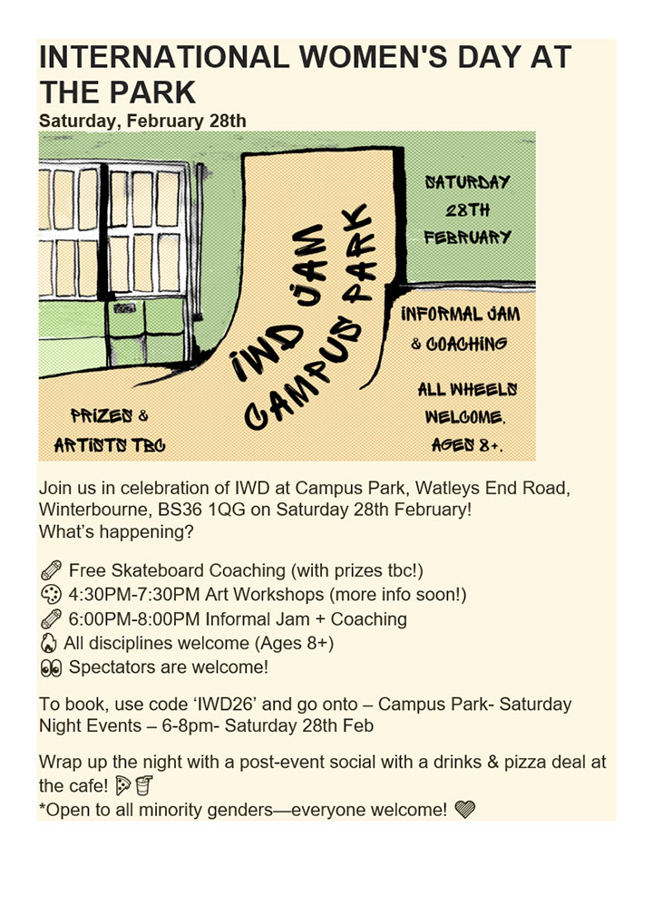 To book, use code ‘IWD26’ and go onto – Campus Park- Saturday Night Events – 6-8pm- Saturday 28th Feb