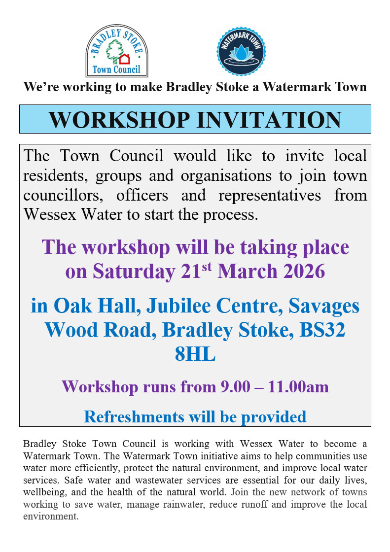 We’re working to make Bradley Stoke a Watermark Town. The Town Council would like to invite local residents, groups and organisations to join town councillors, officers and representatives from Wessex Water to start the process.