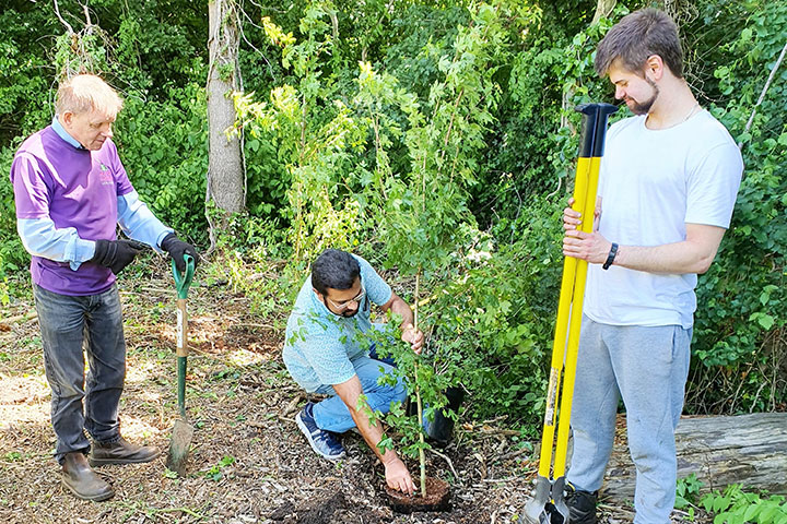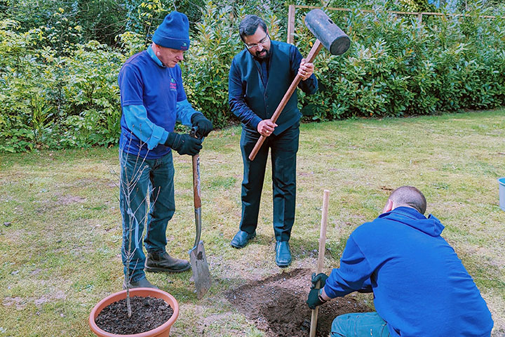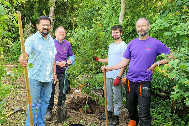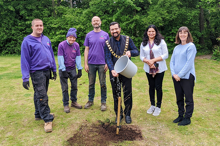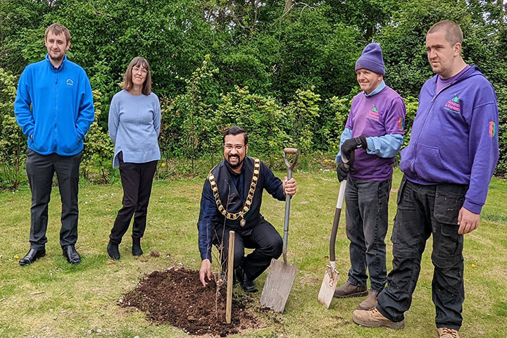 Mayor Tom Aditya planting 2nd oak tree joined by BSTC Activity Centre Manager Phil Francis, Town Clerk Sharon Petela and Brandon Trust staff