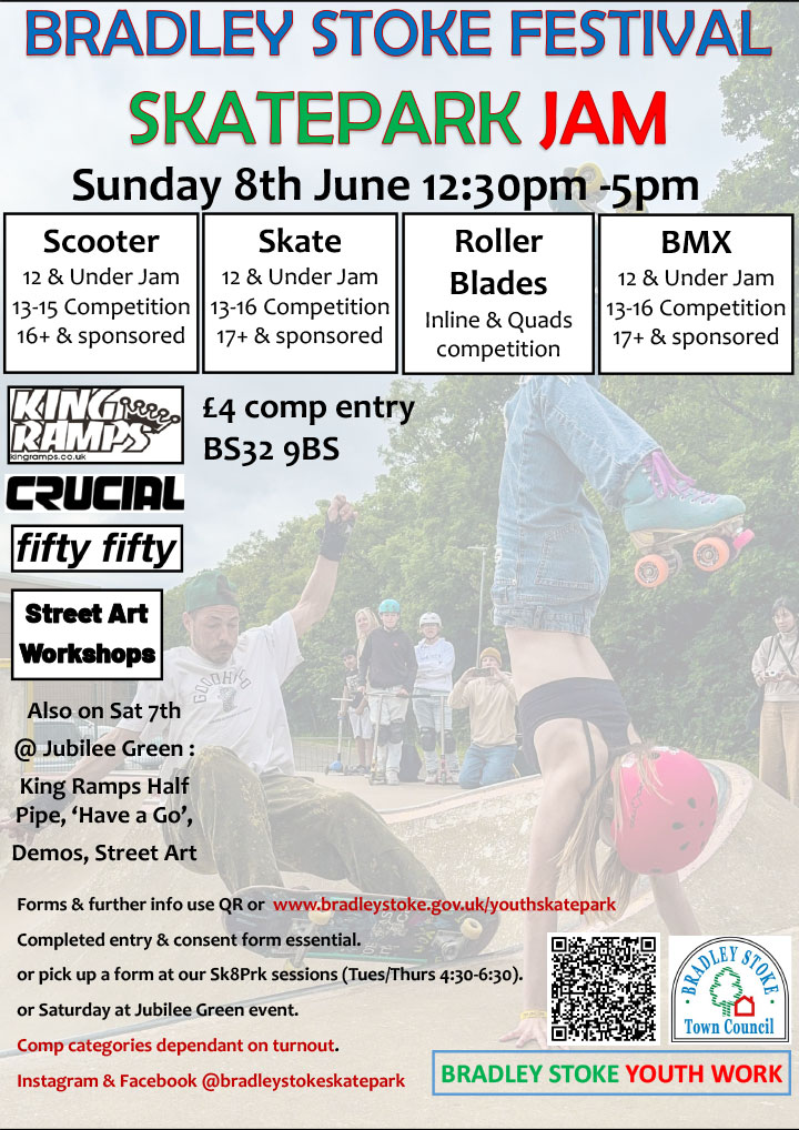 Competition entry forms are available to download from our website or pick up from our Youth Workers or at the Festival on Saturday 7th June. You can also find info on our Bradley Stoke Skatepark Instagram and Facebook pages.